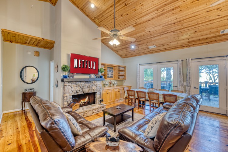 Two living rooms, one up and one down, each with a fireplace and 55″ HDTV with Netflix, YouTube TV Channel Package and iHeart Radio. Very large full kitchen with granite on the main level, and smaller kitchenette area on the lower level with a mini fridge. Full washer and dryer on the main level. Propane grill on the upper deck.