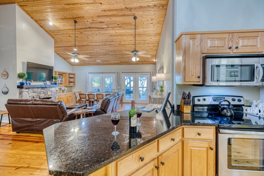 Two living rooms, one up and one down, each with a fireplace and 55″ HDTV with Netflix. Very large full kitchen with granite on the main level, and smaller kitchenette area on the lower level with a mini fridge. Full washer and dryer on the main level.