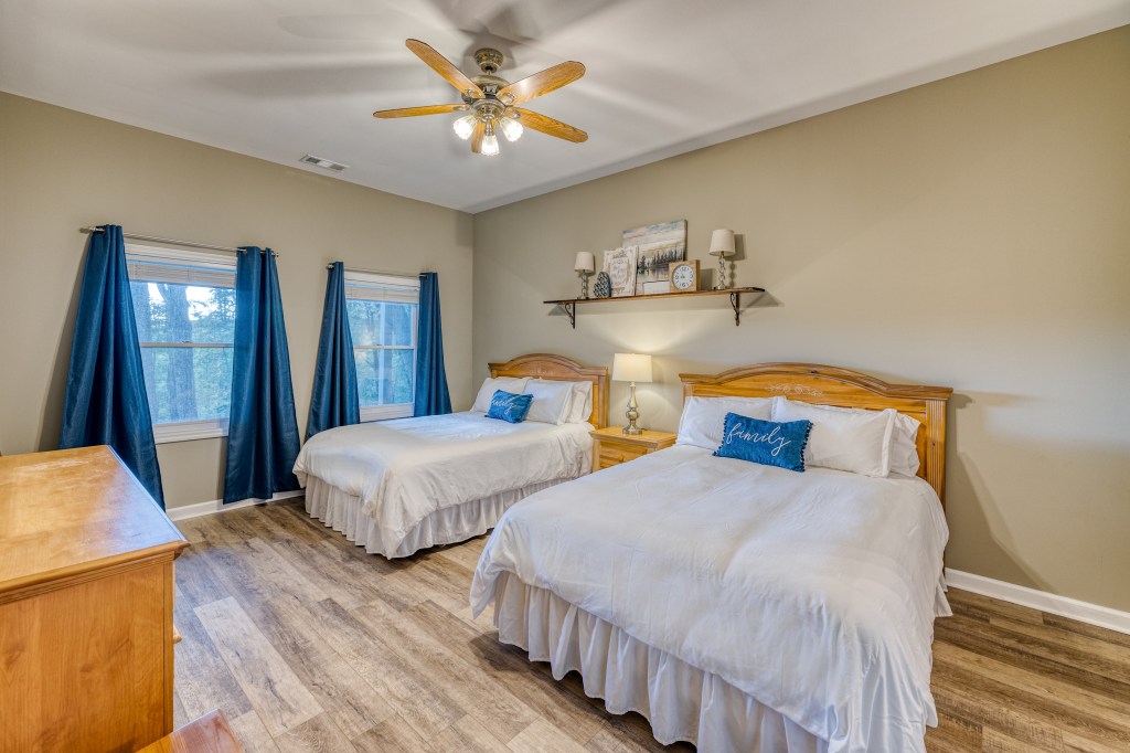 Queen Bunk Suite 2 – One Queen bed and a set of twin bunk beds. Large en suite bathroom with one sink and shower and tub combo.