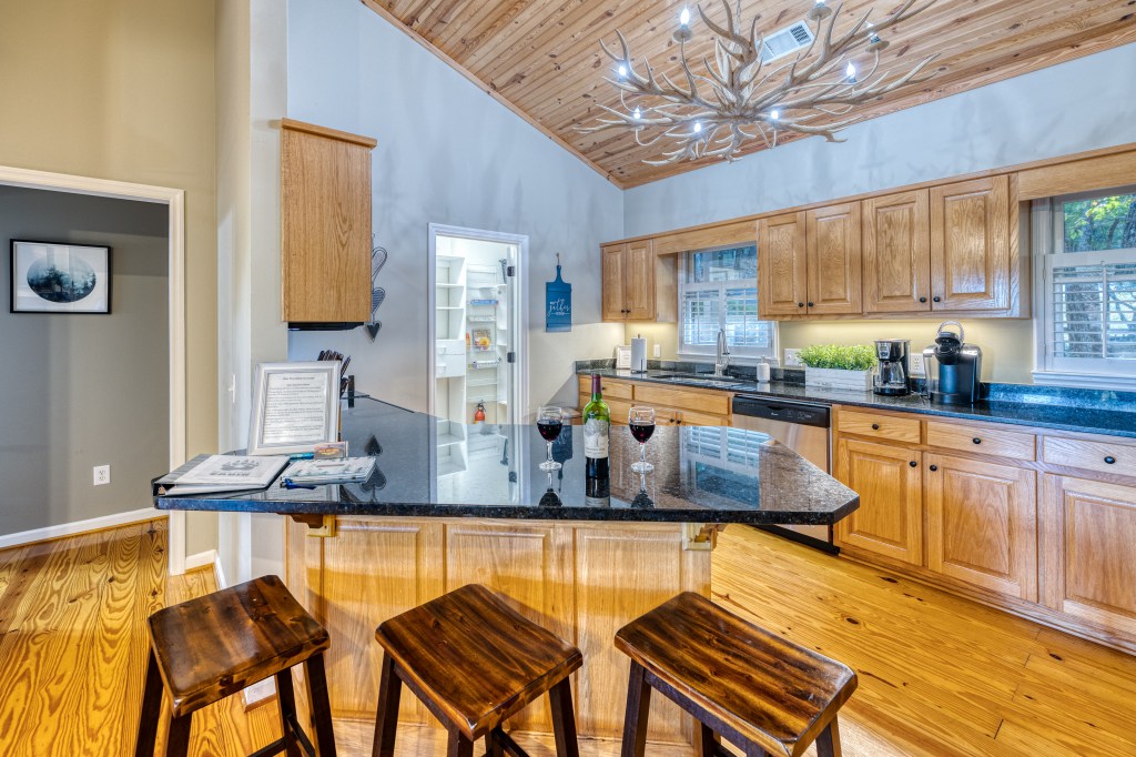 Bear Paw Cabin has a very large kitchen and pantry with plenty of storage. Plenty of counter space allows for overflow seating and a perfect place to set up a buffett for all the guests. There is also a kitchenette on the lower level with a mini refrigerator and microwave. This is great for guest staying on that floor who do not want to come upstairs to grab a quick drink or heat up a snack. We even added a new beautiful chandelier to the main level kitchen!