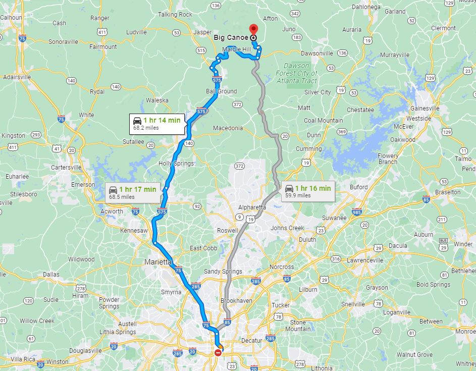 Big Canoe, GA is located 60-68 miles north of downtown Atlanta depending on which roads you take.