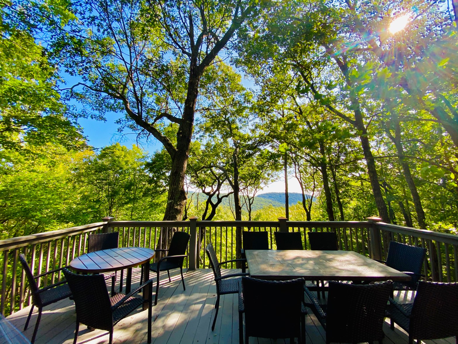 - Outdoor Dining Areas – There is seating for 12 out on the patio that overlooks Cox Mountain. The upstairs patio gives treehouse vibes for sure with great views. Sometimes you can see deer from this porch. There is also a grill out on this porch.