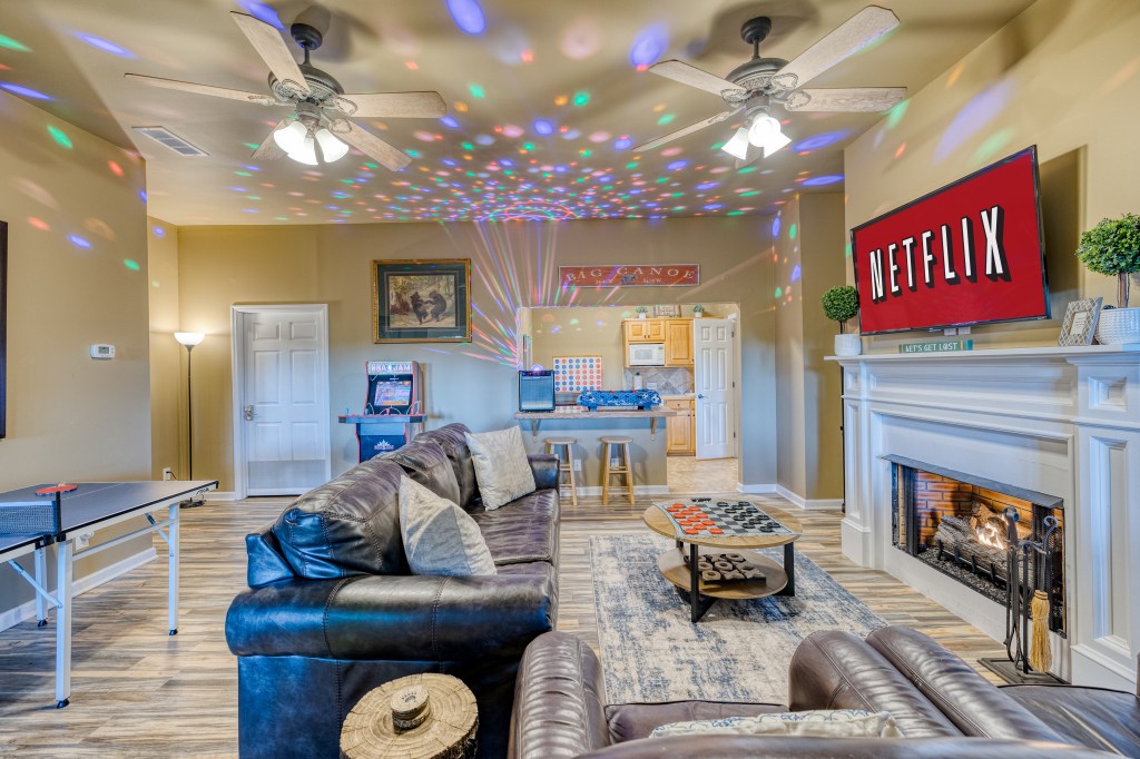 Two living rooms, one up and one down, each with a fireplace and 55″ HDTV with Netflix. Very large full kitchen with granite on the main level, and smaller kitchenette area on the lower level with a mini fridge. Full washer and dryer on the main level.
