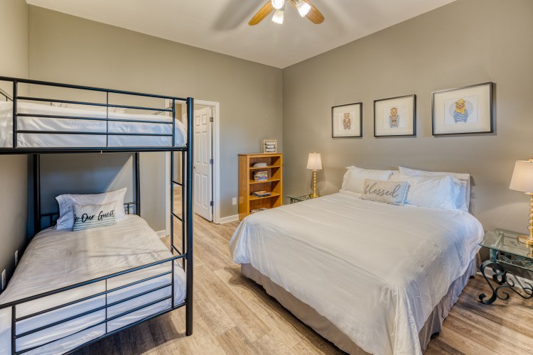 Queen Bunk Suite 2 – One Queen bed and a set of twin bunk beds. Large en suite bathroom with one sink and shower and tub combo.